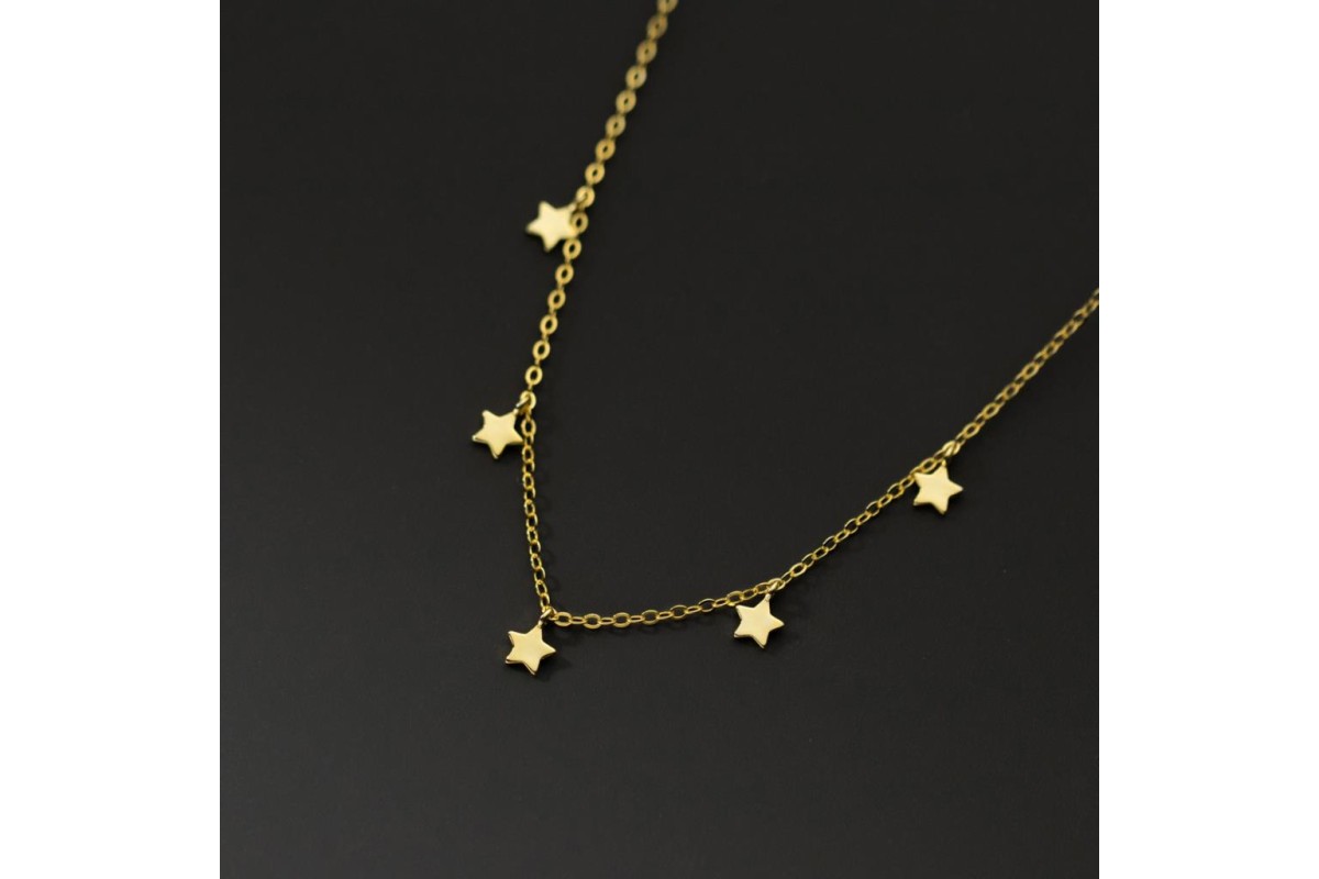 Five Star Necklace by White Leaf, featuring a delicate chain with evenly spaced star charms. A subtle statement that's perfect for everyday wear or layering.