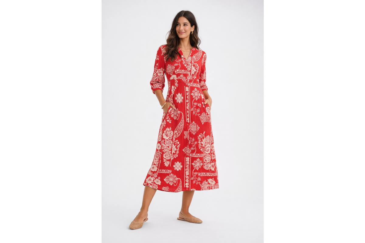 This beautiful red midi dress is one of those pieces that does all the work for you. The striking ivory print lifts the colour perfectly, giving it that relaxed, slightly bohemian feel while still looking polished.