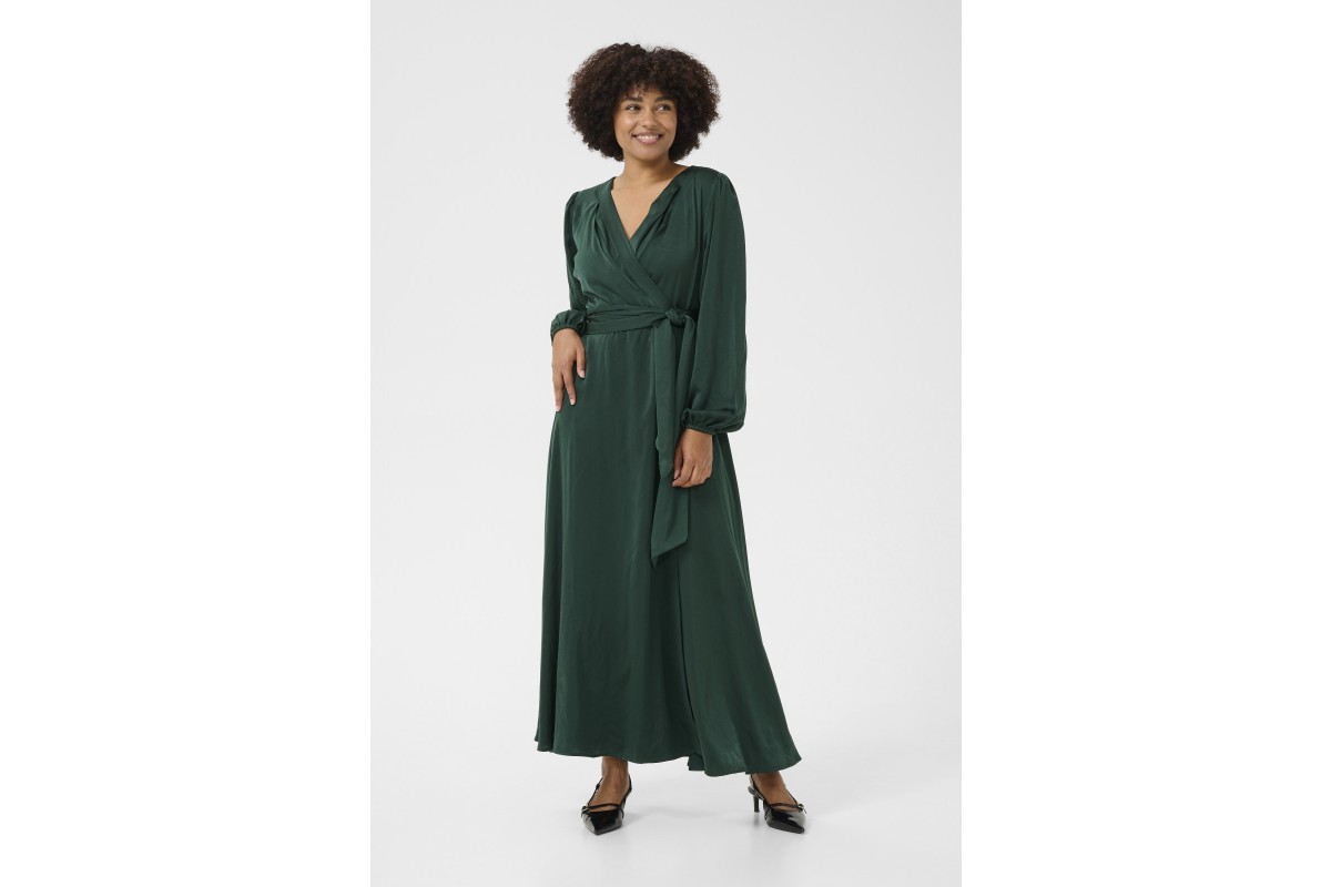 The faux-wrap bodice and self-tie waist create a flattering silhouette, while softly gathered sleeves add a romantic touch. The long flowing skirt moves gracefully with every step, finished with a gentle side split for ease and just the right hint of drama.