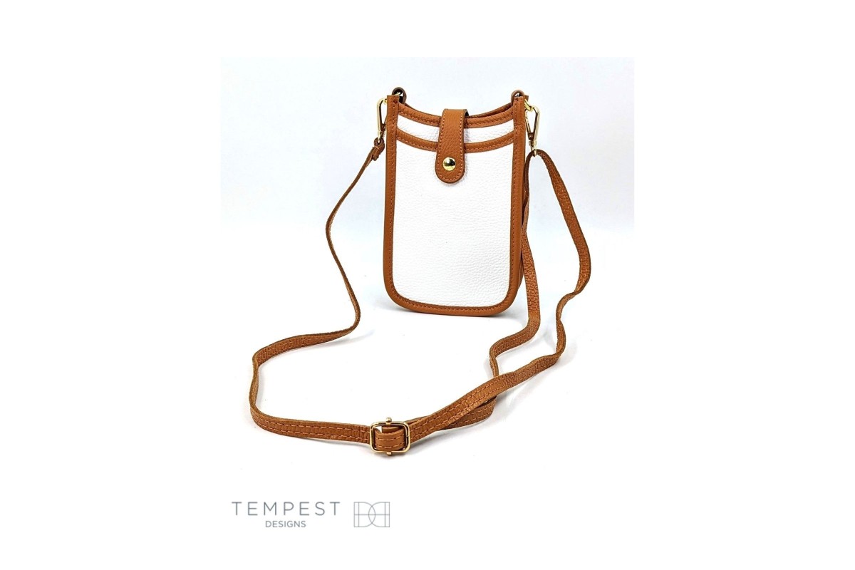 Keep your essentials close at hand with this stylish crossbody phone bag. Crafted from soft leather with contrast tan trims, it’s the perfect size for your phone, keys and a card or two – ideal when you’re travelling light.