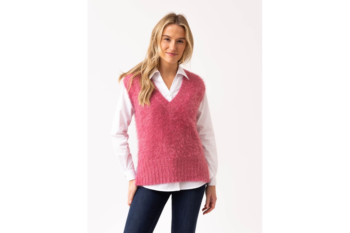 Your versatile layering piece for the season ahead. This sleeveless v-neck jumper from Marble is made in a super-soft feather yarn that feels cosy without the bulk. Ribbed detailing at the neckline and hem, plus side splits, make it easy to wear. In this gorgeous soft rose pink, it’s a modern neutral that pairs with just about anything.