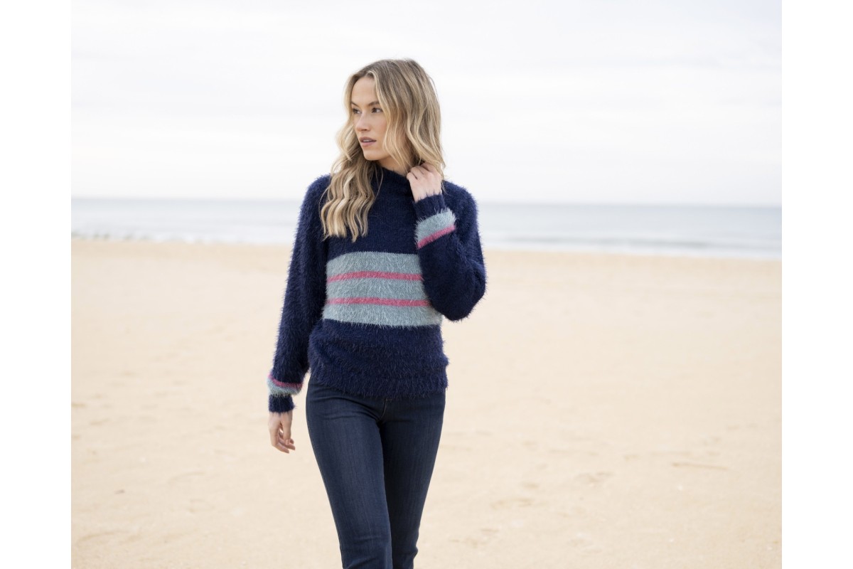 Cosy just got chic. This Marble jumper is knitted in ultra-soft feather yarn with a relaxed fit and turtle neckline. Designed in navy with contrast colour-block stripes and rib tipping detail at the neck, cuffs, and hem, it’s the perfect balance of comfort and style.