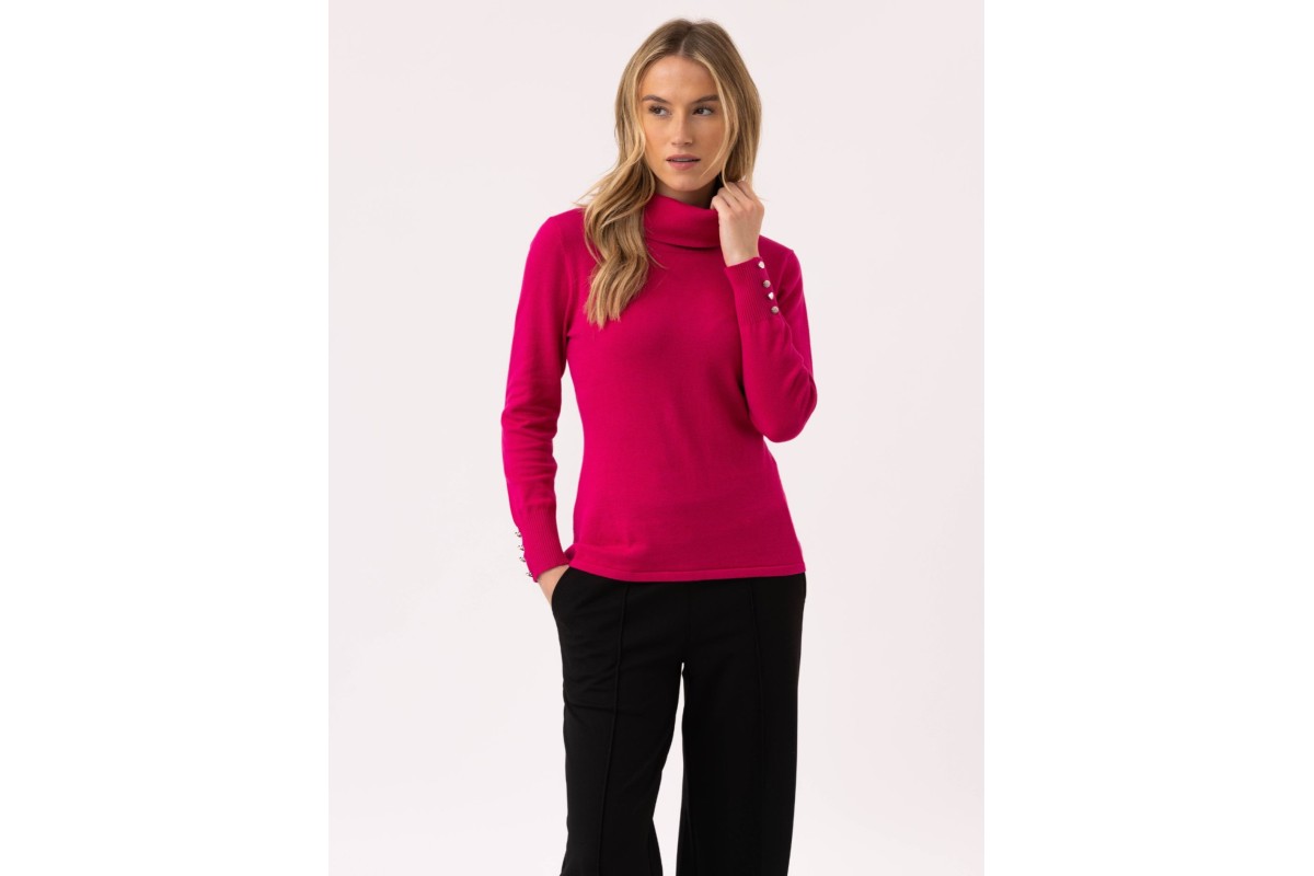 Soft and feminine, this Marble cowl neck jumper in fuchsia pink is a wardrobe favourite. Made from 100% cotton, it offers a comfortable longer fit with a flattering draped neckline and button detailing on the sleeves. Pair with tailored trousers for a smart look, or style casually with jeans for easy everyday wear.