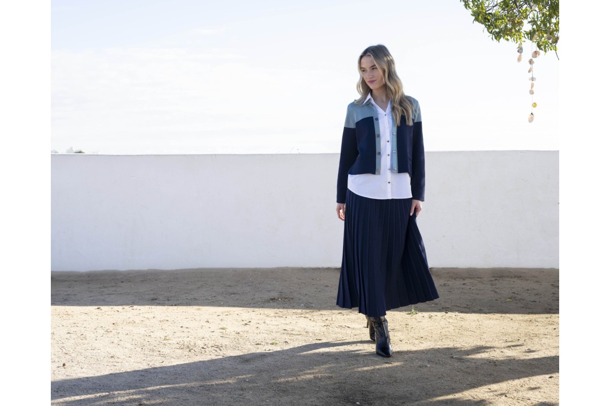 Meet your new favourite swish skirt. This Marble pleated midi in navy is 100% cotton, giving it a natural, breathable feel with every wear. The elasticated waist means all-day comfort, while the 77cm / 30-inch length makes it effortlessly chic. Oh — and if you love it, it’s also available in classic black.