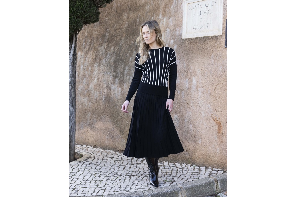 Monochrome magic. This Marble jumper takes a classic stripe and makes it bold with vertical white lines on black. Soft, flattering, and easy to wear, it’s finished with a round neckline and ribbed trims for a polished look. Style it with jeans for everyday or pair with a pleated skirt for something a little dressier.