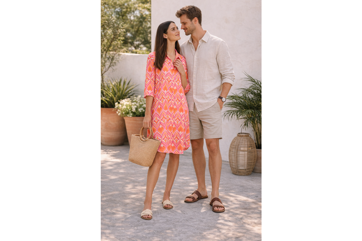 Say hello to easy summer dressing with a bit of personality. This vibrant shirt dress comes in a bold coral and pink geometric print that does all the talking, so you don’t have to.