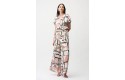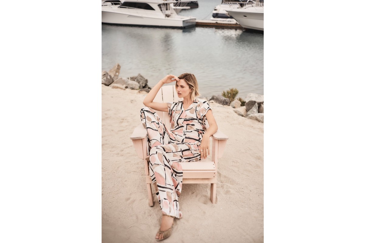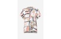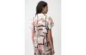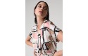 A bold abstract print brings edge to this recycled hammered satin top. The shirt collar and V-necklineline offer a polished contrast to the relaxed boxy shape, finished with short dolman sleeves and a front pleat.