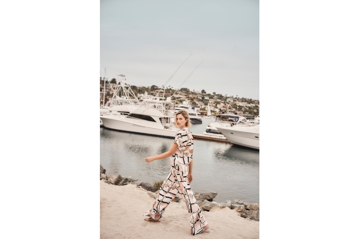 Flowy and statement-making, these recycled satin pants feature an abstract print, a folded waistband with shirred elastic at the back, and a removable sash with D-ring detail for a polished finish.