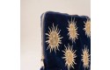 Elizabeth's hand-drawn sun motif is emblazoned onto a soft velvet base, with intricately embroidered gold and vanilla threads. She has depicted the sun with a human-like face, imagining our most powerful star as a character who radiates warmth and life.