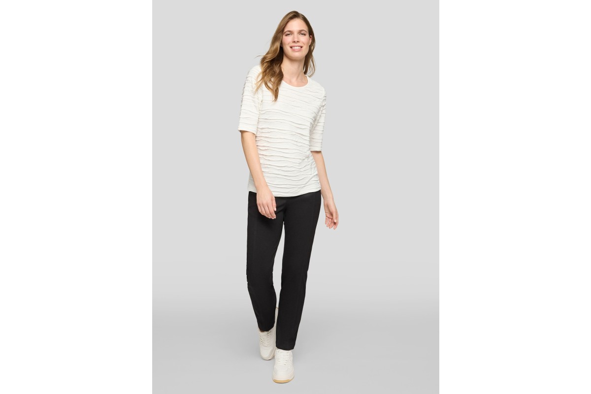 This softly textured tee from Rabe has a subtle ruched effect through the fabric, which gives it shape, movement and a slightly more elevated feel than a classic T-shirt. It skims the body beautifully without clinging and the elbow-length sleeves make it an easy, flattering choice for everyday wear.